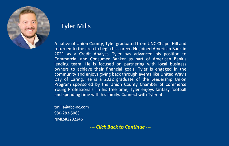 Tyler MillsWingate - Marshville - Monroetmills@abc-nc.com980-283-5083NMLS #2232246 |