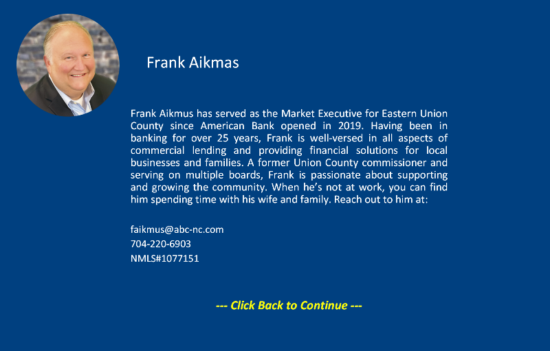 Frank AikmusMonroe - Waxhaw - Indian Landfaikmus@abc-nc.com704-220-6903NMLS #1077151 |